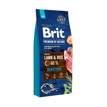 Brit Premium By Nature Sensitive to pełnoporcjowa sucha karma z jagnięciną i ryżem, przeznaczona dla dorosłych psów wszystkich ras z wrażliwym przewodem pokarmowym.