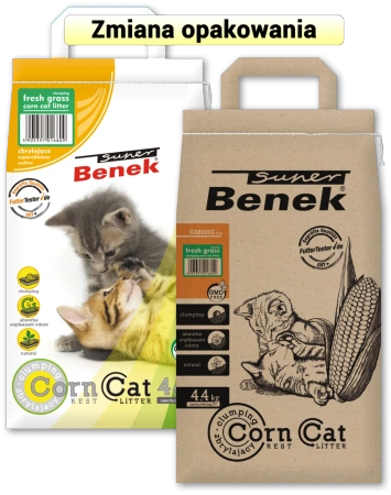 Żwirek dla kotów Super Benek kukurydziany, zbrylający. Idealne podłoże dla kotów dorosłych i kociąt a także dla królików, gryzoni i ptaków. Podłoże wyprodukowane na bazie naturalnego surowca. Produkt cechuje ograniczone wynoszenie poza kuwetę. Doskonale pochłania wilgoć i nieprzyjemne zapachy zapewniając poczucie komfortu i niezbędną higienę.