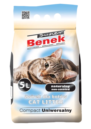 Kocią toaletę napełnić żwirkiem "Super Benek Uniwersalny Compact".