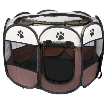 Składany, tekstylny kojec wykonany na planie ośmiokąta przeznaczony dla psów, szczeniąt, kotów oraz niewielkich zwierząt. Kojec jest idealnym rozwiązaniem dla właścicieli zwierząt, szczególnie gdy zajdzie potrzeba wydzielenia swoim pupilom bezpiecznej przestrzeni. Produkt nadaję się do użycia zarówno w domu jak i w plenerze.