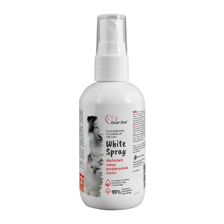 OVER ZOO White Spray to profesjonalny płyn do usuwania zażółceń sierści spowodowanych jedzeniem, łzami lub innymi wydzielinami. White Coat przywróci naturalny kolor sierści Twojego pupila. Polecany przez hodowców i salony pielęgnacji. GWARANTOWANY EFEKT już po tygodniu stosowania!